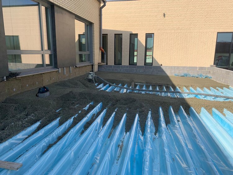 Kai medžiaga visiškai sukietėja, klojama garso ir garų izoliacinė PE plėvelė (PE5/300) kaip tarpsluoksnis prieš galutinės dangos įrengimą.